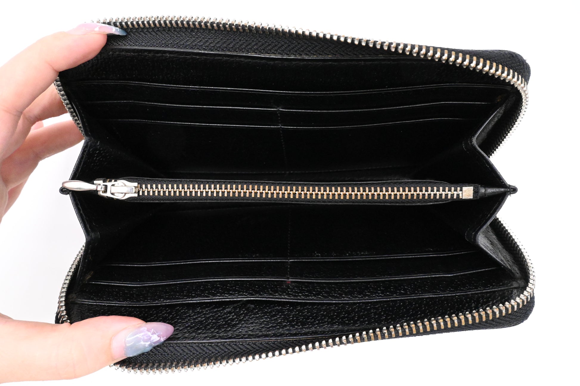 - Other: Some coin residue inside the central zipped pocket