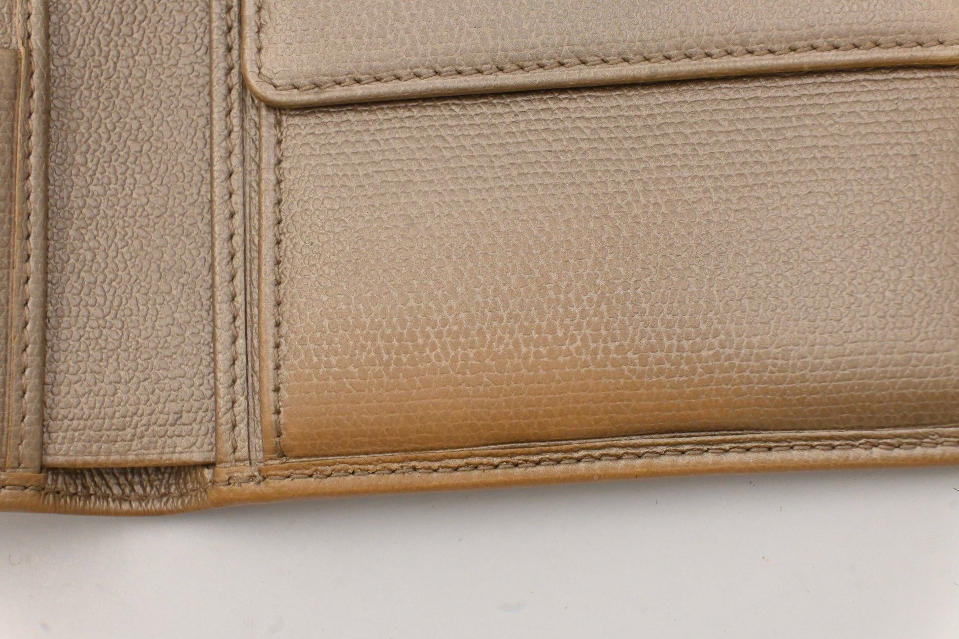 - Hardware: Beige enamel and silver tone metal, light surface wear, interior button snap is strong