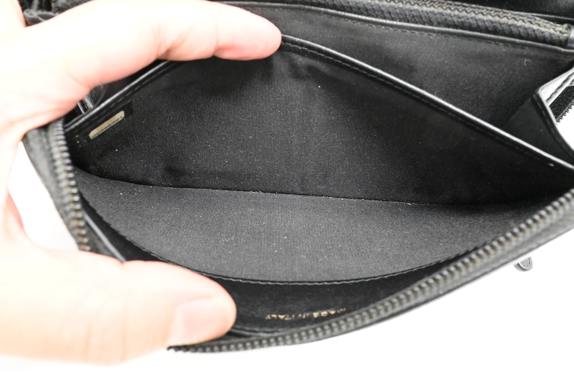 - Hardware: Silvered gold tone. Smooth zipper. The leather pull tab seems a little fragile