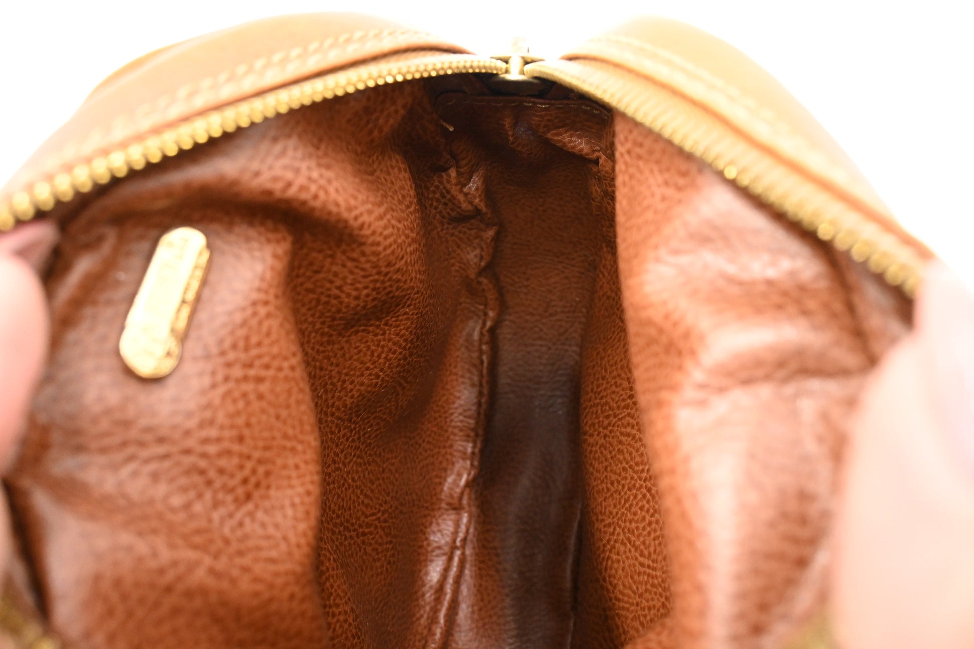 - Hardware: Gold tone. Slight silvering and surface marks