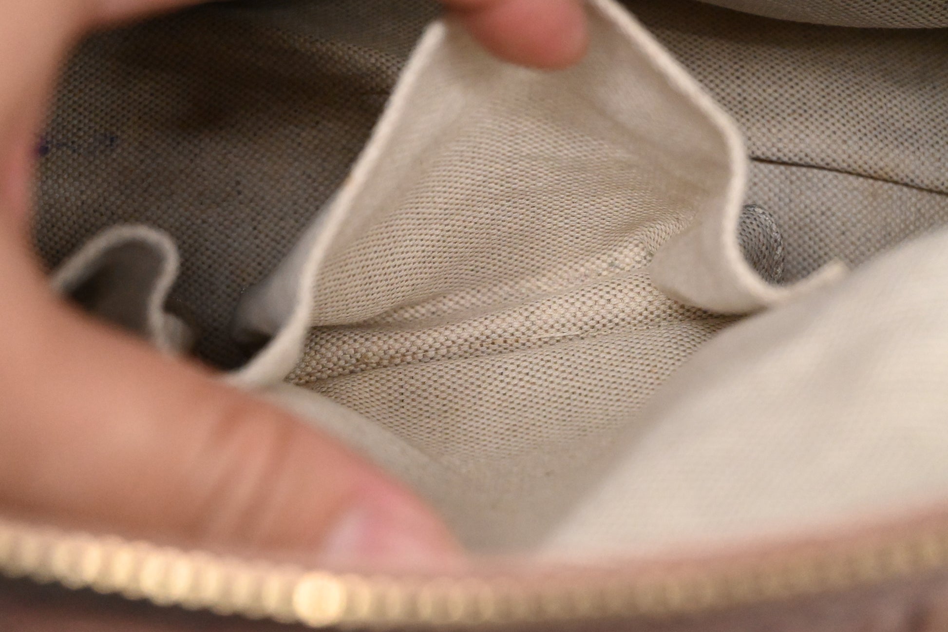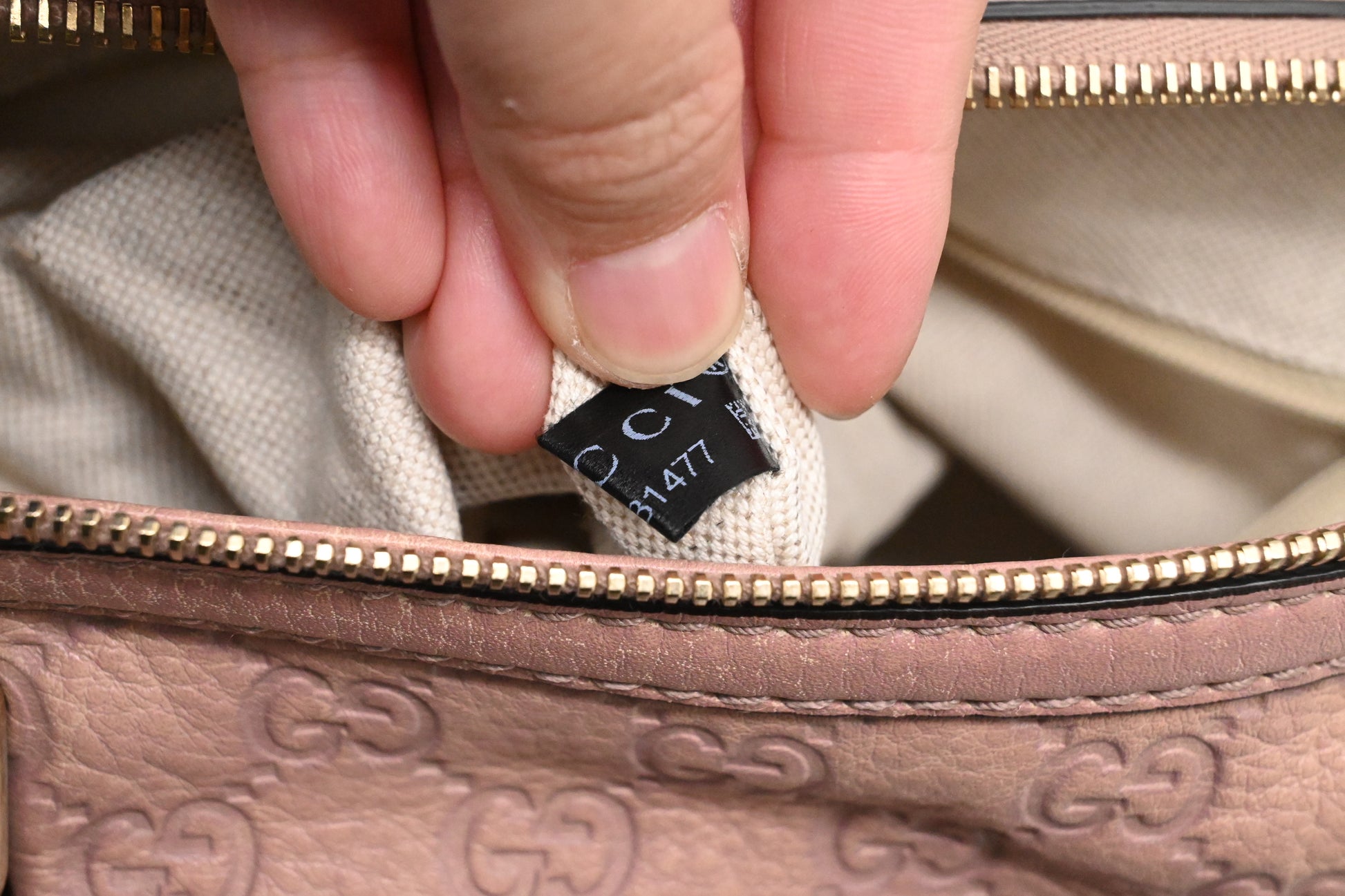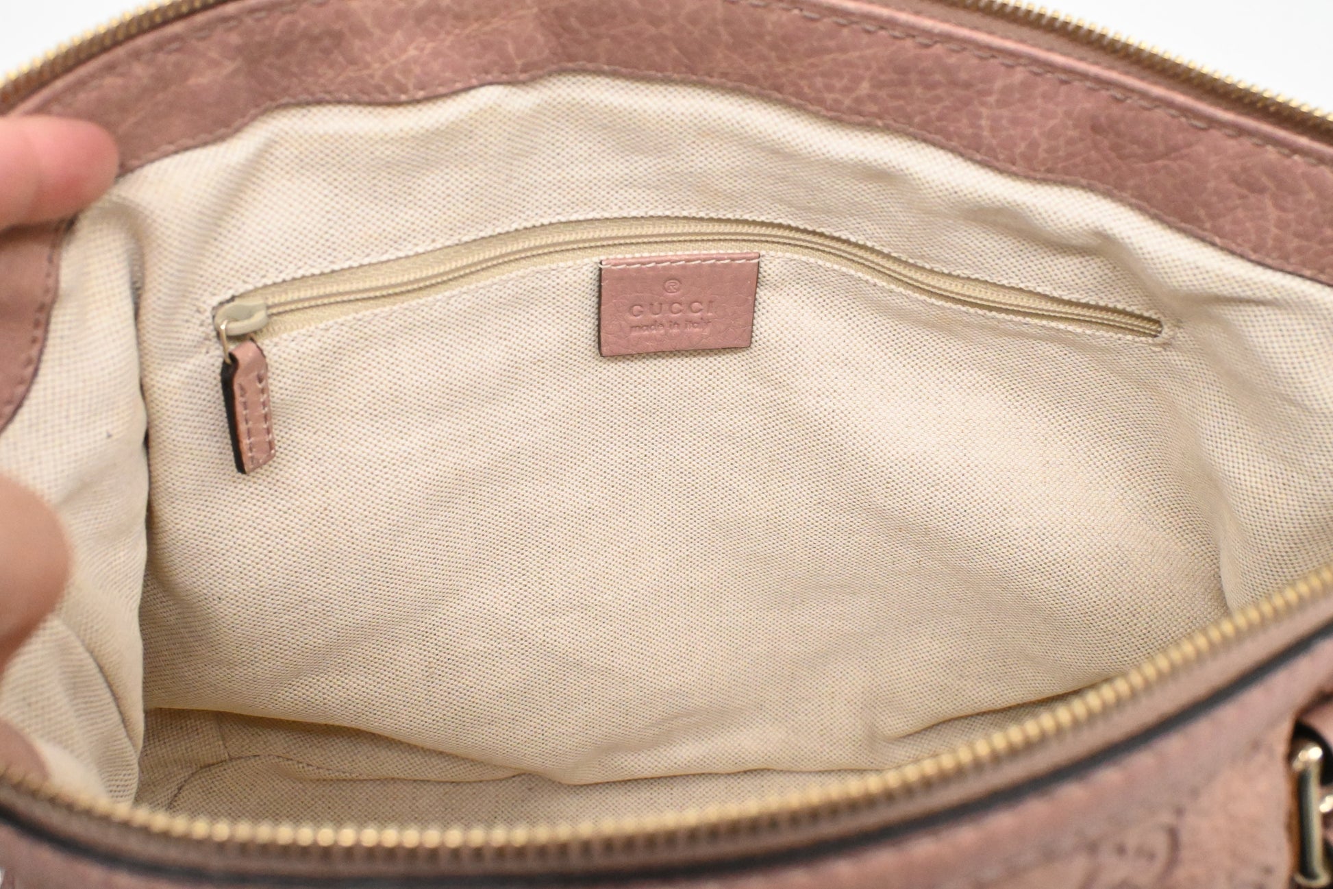 - Hardware: Shiny champagne gold tone. Zipper runs well