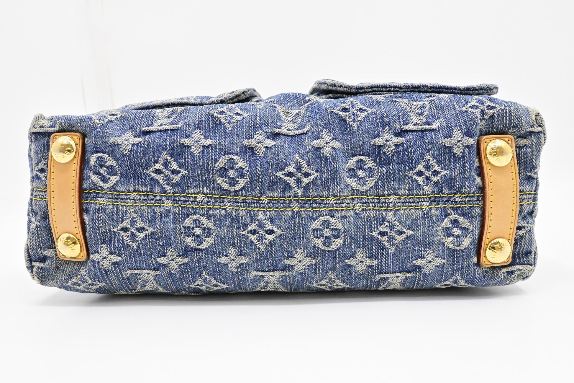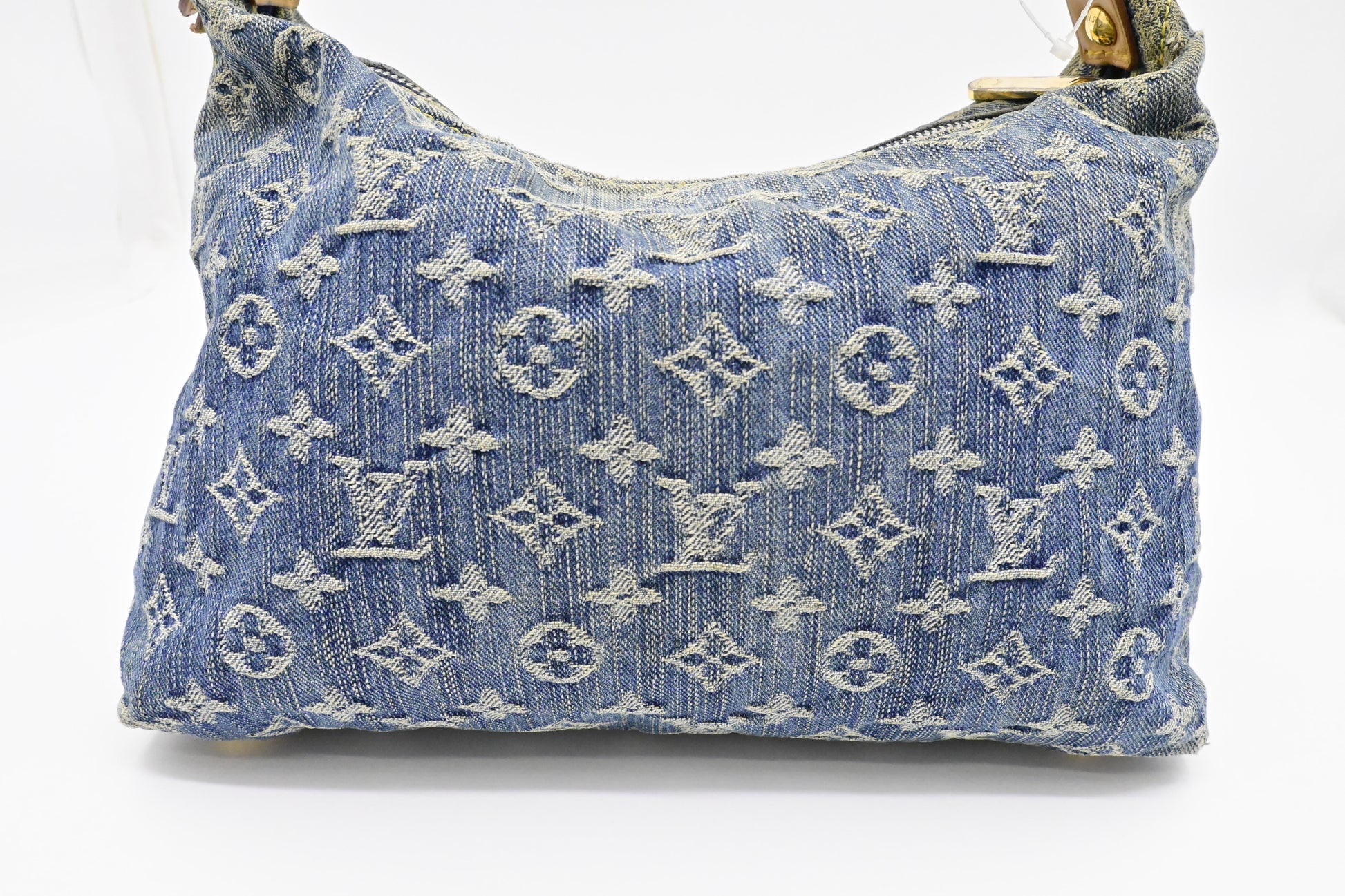 The denim canvas is looking clean and solid while having a color change on the top of the bag. The vachetta parts are bright and solid with the faintest signs of use. Good corners. Shiny gold tone hardware with a slight touch of silvering on the smooth zipper pulls.