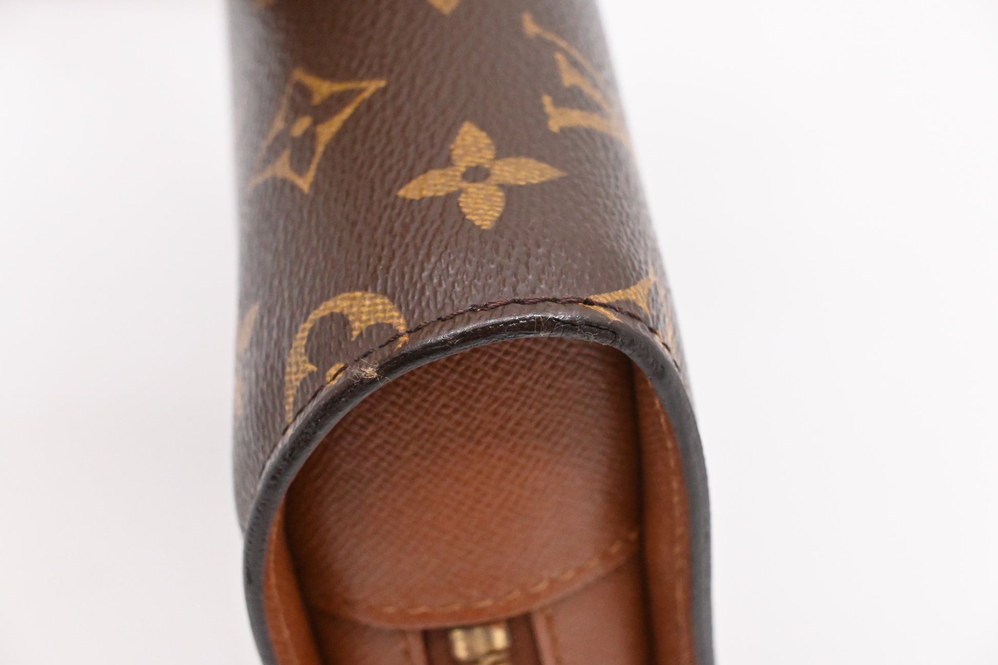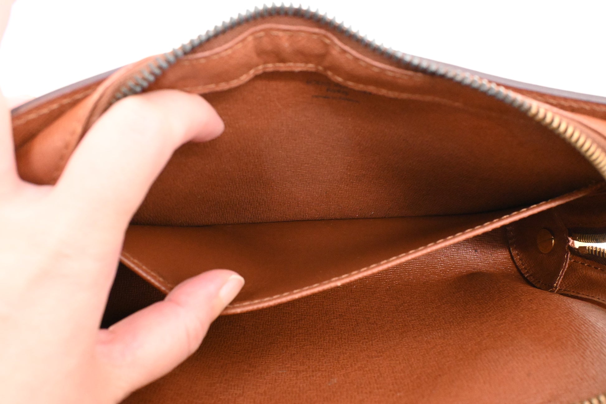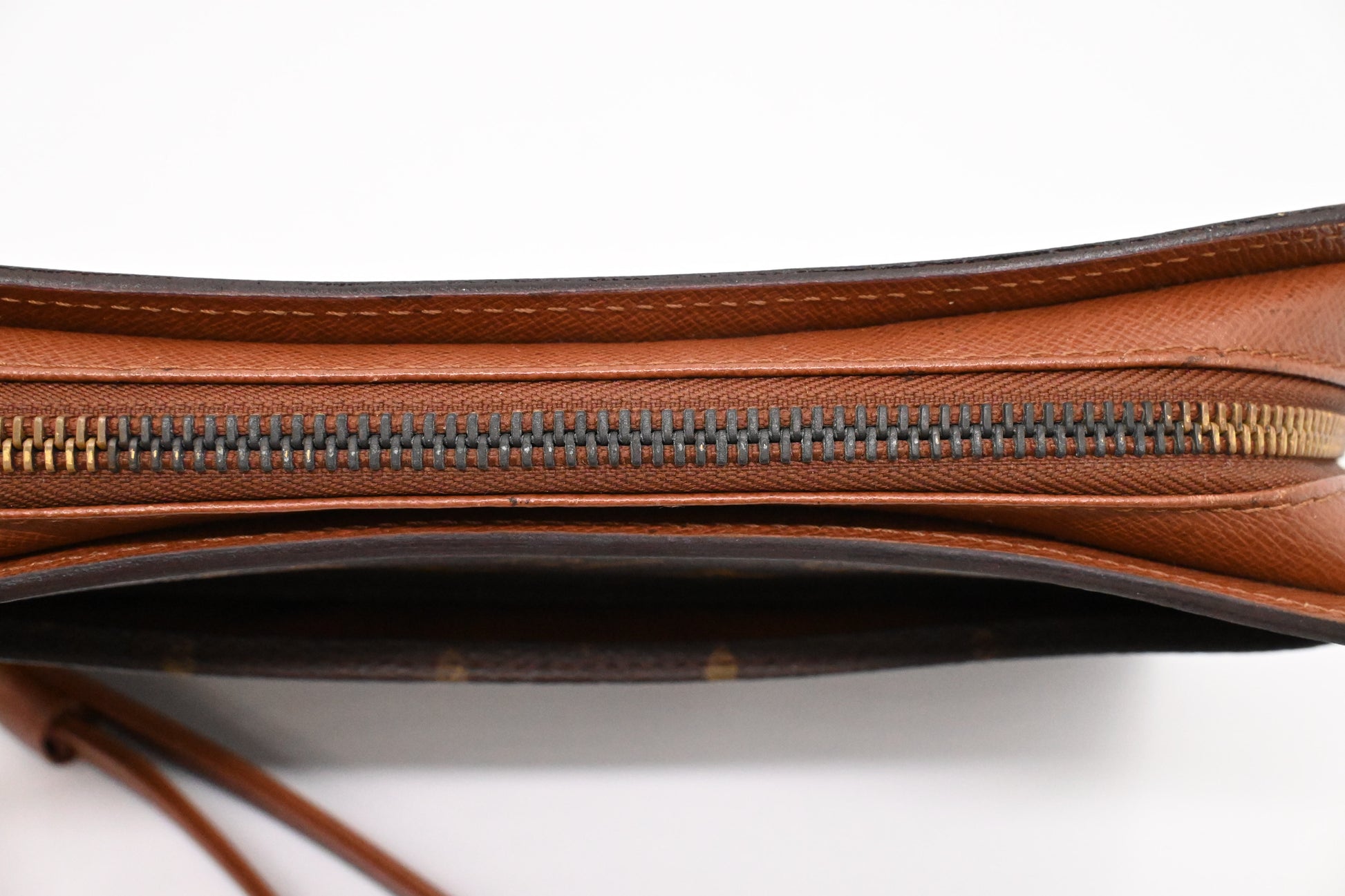 - Hardware: Shiny gold tone with some tarnish on zipper, smooth zipper