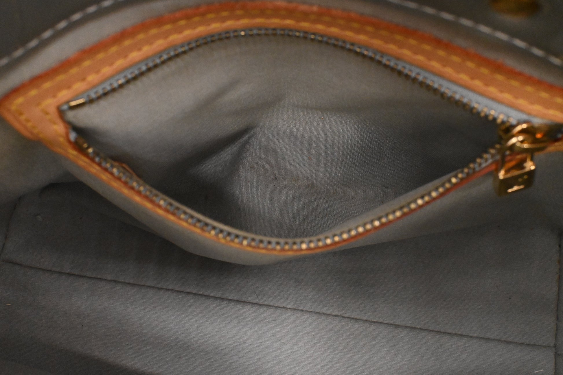- Hardware: Shiny gold-tone, smooth interior zipper