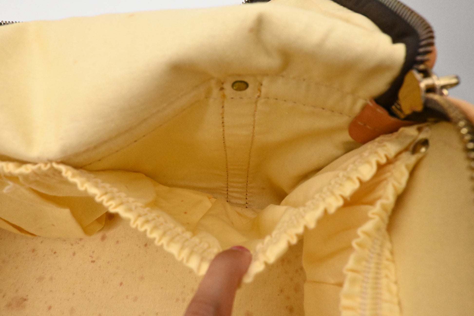 - Hardware: Gold tone. Some signs of use and oxydation residue. Zippers are a little stiff