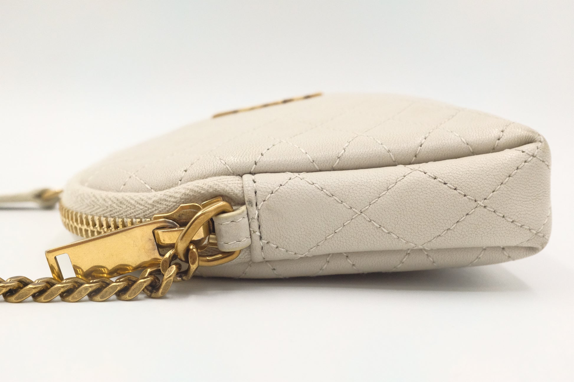 - Hardware: Gold tone. Light silvering on the zipper pull. Smooth zipper